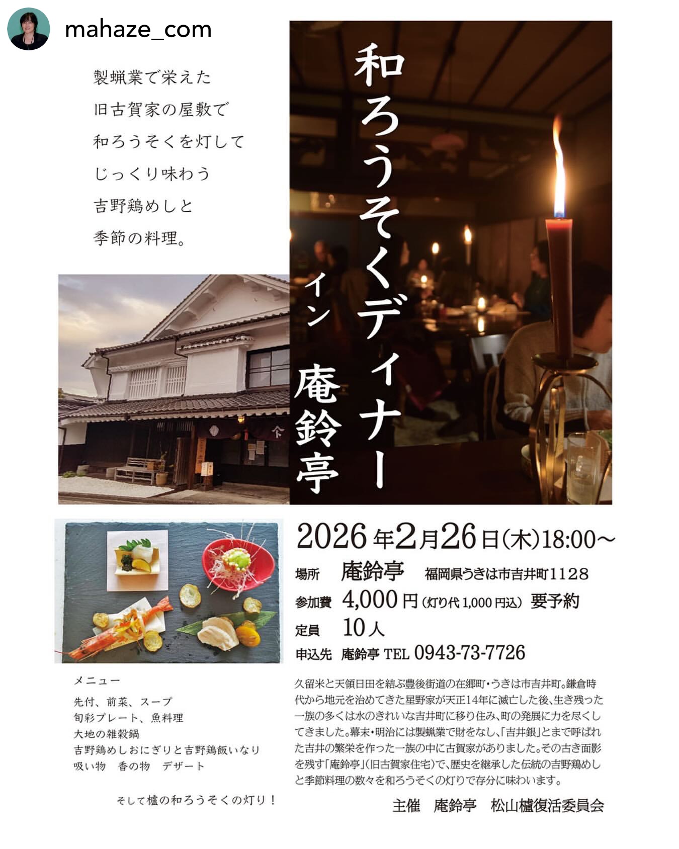 幕末・明治に製蝋業で財をなし、吉井⽩壁⼟蔵に⾯影を残す「庵鈴亭」(旧古賀家住宅)で、歴史を継承した伝統の郷土料理「吉野鶏めし」を、和ろうそくの灯りで存分に味わいます。